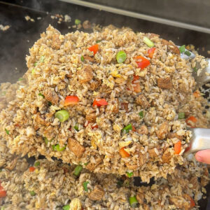 - Add the day old rice and diced red bell pepper to the griddle, breaking up any clumps with a spatula. Cook for 2–3 minutes, stirring occasionally, allowing the rice to heat through and develop light crispy edges.