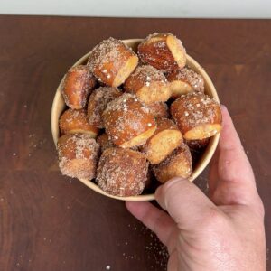 - Place the pretzel bites in a large bowl and lightly spray them with avocado oil. Toss gently so each pretzel bite gets a thin coating of oil.