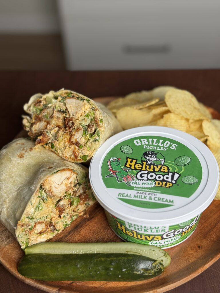 - Slice each wrap in half and serve immediately with ridged potato chips and extra dill pickle dip on the side. Enjoy while warm for the best balance of crispy, creamy, and spicy flavor.