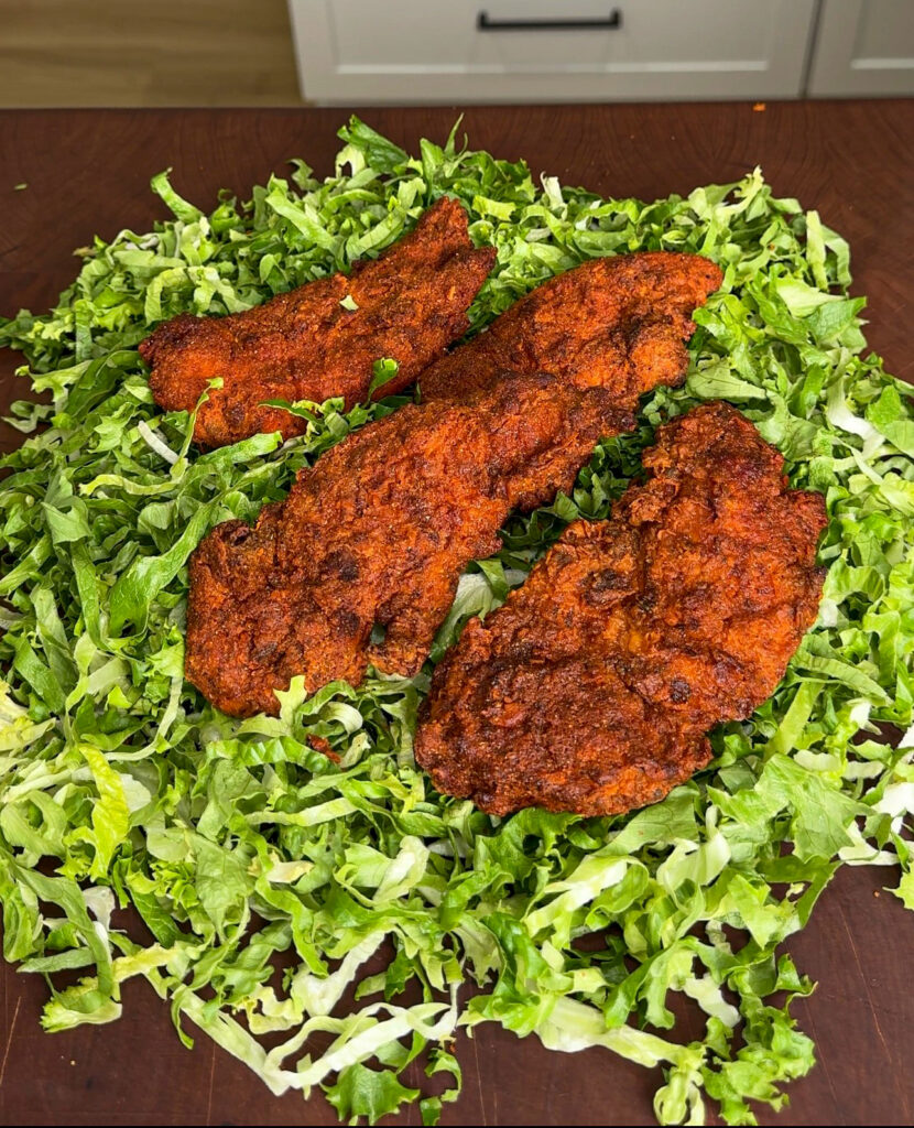 Nashville hot chicken is a famous Southern dish known for its crispy fried chicken coated in a spicy oil-based sauce made with hot sauce, paprika, and plenty of cayenne pepper. The result is chicken that’s crispy on the outside with a bold, spicy kick in every bite.