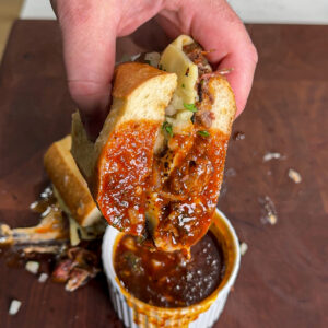 - Remove the beef and shred finely, then return it to the rich consommé to stay moist. Toast the sandwich rolls, spread with mayo, pile high with shredded beef, top with white American cheese, cilantro, and diced onion, and serve with a side of warm consommé for dipping.