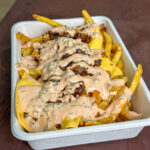 Top the cheesy fries generously with the caramelized onions, then drizzle the chilled spread over the top using as much or as little as you prefer. Serve immediately while everything is hot, melty, and loaded with flavor.